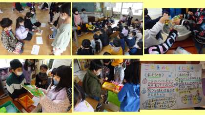 2年生が、生活科の『あそんで ためして くふうして』という単元でつくった遊びができる「遊びランド」に、1年生を招待してくれました。ボウリングや風で動く車、身近なものでつくった楽器、迷路など、どの遊びも作りやルールが工夫されており、1年生もとても楽しんでいました。2年生が笑顔で丁寧に説明し、遊びを進めてくれたので、1年生も安心して活動することができていました。