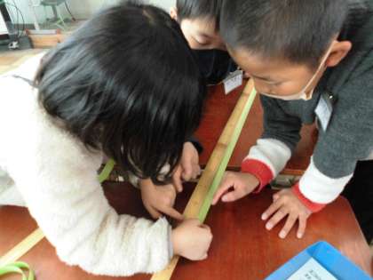 テープを作った子どもたちは、「このテープで1mのものを見つけたい!」と言い、教室や家の中にある1mのものをたくさん見つけました。これからも、たくさんの1mに出会えるといいですね!