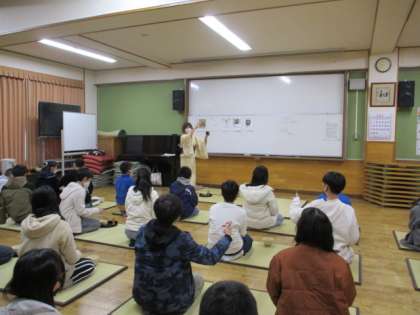 今日は、お茶の先生に2名に来ていただき、茶道体験をしました。はじめに、茶道についてのお話を聞き、見本のお点前を見せていただきました。