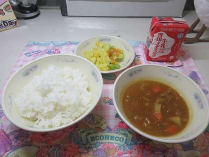 今日の給食は、「ごはん・牛乳・ポークカレー・カラフルホットマリネ」でした。