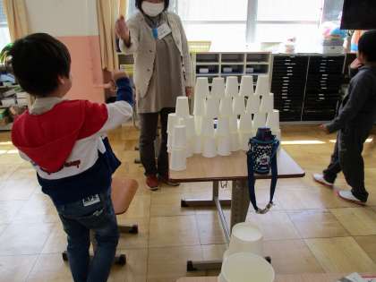 紙コップを使って、一つずつゆっくりとていねいに積み上げていきます。せっかく積めたコップが、気をゆるしたとたんにばらばらばら・・・・。でも、あきらめません。もう一度挑戦して、すごく高いタワーができました。よかったね(^^)/