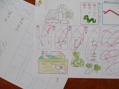 今日は、「へ」のプリントの裏が宿題になっています。色もていねいにぬれるといいですね。できたプリントは、月曜日に忘れずに持って行きましょう。