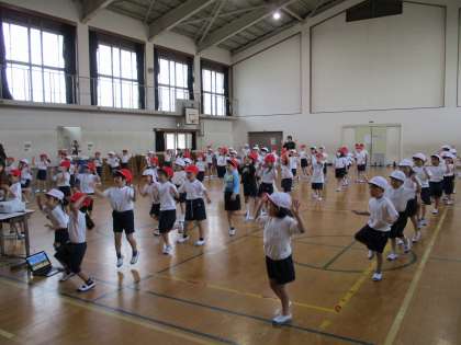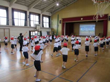 その後に、ダンスのお手本を見ながら曲に合わせて跳んだりはねたりしながら、笑顔いっぱいで踊りました。少し肌寒い朝でしたが、体中がポカポカしてきました。