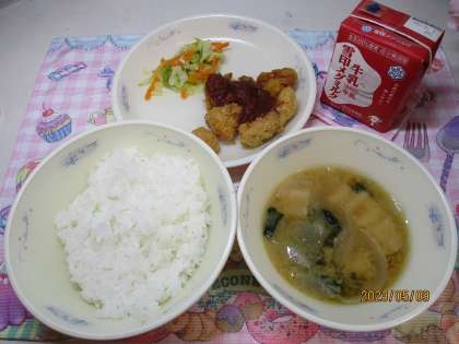 あまからいソースをかけて食べるサクサクのチキンカツは子どもたちに大人気のメニューです。みそ汁は、京都市右京区の京北地域で作られた「京北みそ」を使った地産地消の献立です。「チキンカツもっと食べたかった。」「チキンカツは一番好きだから最後まで残しておく!」「今日の献立は全部好きなものだった。」「みそ汁のきりふがおいしい。」とたくさん感想を伝えてくれました。