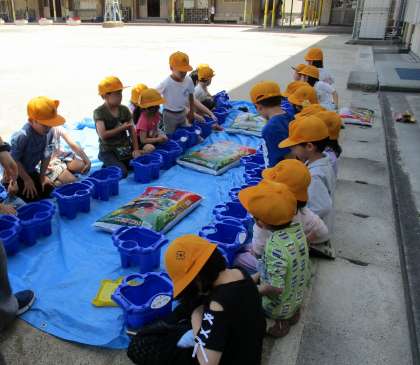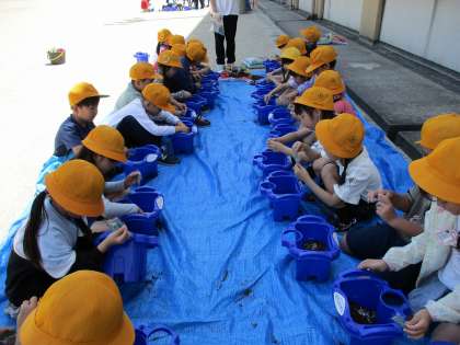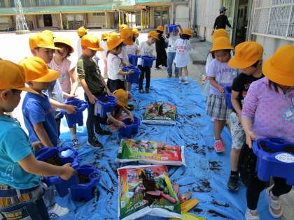 朝顔の種まきに向けて、土づくりをしました。自分の鉢に新しい土と肥料を入れて、元気な朝顔が育つようにゆっくりとていねいに混ぜました。