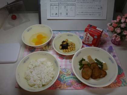 今日の献立は、麦ごはん・牛乳・平天の煮つけ・こんぶ豆・フルーツ寒天でした。