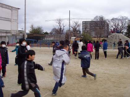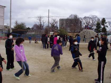 校内でインフルエンザ・風邪などの心配が続く中,休み時間に全員遊びをして,体力作りをしているクラスもありました。今日は大縄跳びの日でした。4年生の隣りでも,大縄跳びをしている学年もありました。