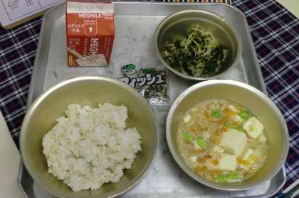 今日の献立は,「むぎごはん,牛乳,かにととうふのくず煮,ほうれん草ともやしのいためナムル,じゃこ」でした。