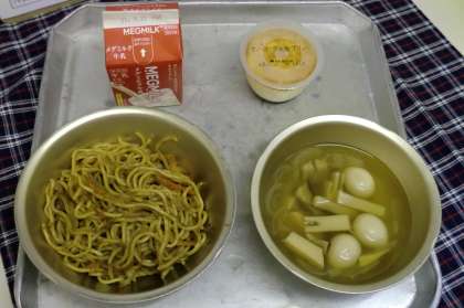 今日の献立は,「焼きそば,スープ,牛乳,焼きプリン」でした。