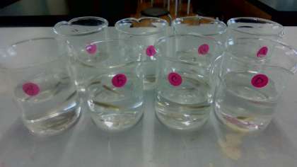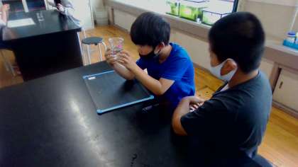 授業の最後に「A〜Hの容器に入っているメダカはオスかメスかどちらでしょう?」の問題にチャレンジしました。メダカを真剣に観察し、オスとメスの特徴を確認しながら、答えを導き出すことができました。
