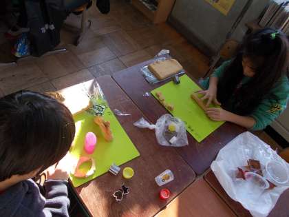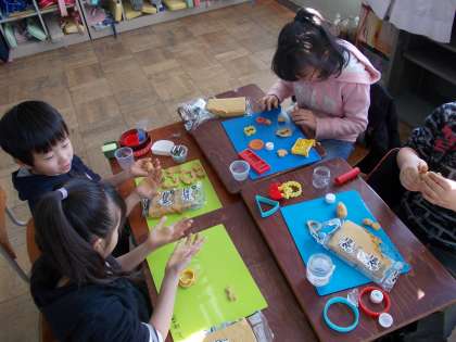 型をぬいたり,もようをつけたりして思い思いの作品を作りました。