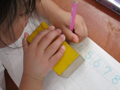 その後、積み木の面の「しかく」「さんかく」「まる」を使って、楽しい絵を描きました。3つの形からイメージを膨らませていました。
