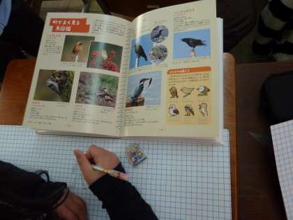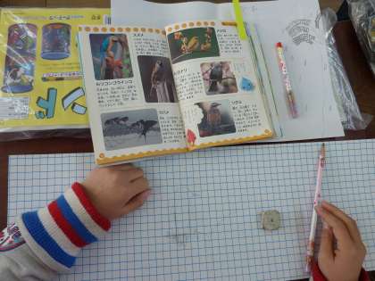 図工の学習で,ステンドグラスの様なデザインを考えています。いろいろな本を参考にして,黒と他の色とのバランスを考えながら,熱心に下絵をかいていました。