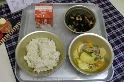 今日の献立は,「むぎごはん,牛乳,煮つけ,ひじき豆」でした。