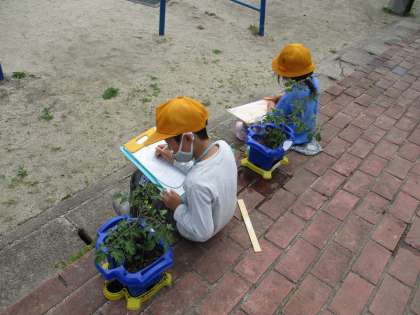 休み時間になると、「今日は暑いし野菜たちものどが渇いてるはずだから、お水をあげに行こう!」と外に行っています。実ができてきている野菜もあり、収穫を楽しみにしている子どもたちです。