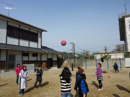 今日のみんな遊びは「バレーボール」です。ドッジボールで,どうやってバレーボールをするのかと思っていたら,怪我をしないよう,上手にはじいて楽しんでいました。