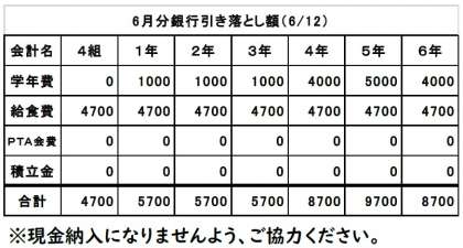 6月は、6月12日(月)に6月分の引き落としになります。金額をご確認の上、前日までにご入金をお願いいたします。
