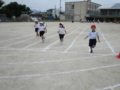 「ジャンボリーミッキー」の曲に合わせたダンス・クラス対抗の玉入れ・ゴールを目指してまっすぐに走る 50m走とどの種目も元気いっぱいでした。