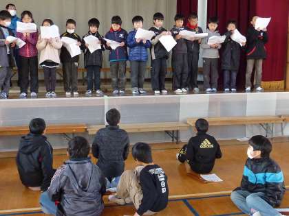 今日は,リコーダー・群読・体育・ダンスの発表練習をしました。リコーダーは「少年時代」を合奏します。ダンスは,「マル・モリ・ダンス」です。写真は群読の練習と,代表者の台詞練習の様子です。