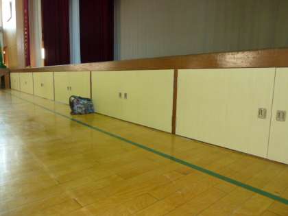 以前から,体育館ステージ下の物入れの扉に,穴が開いていました。何かが当たって破れたと思われます。先週,化粧板を張って美しくしてもらいました。