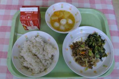 今日の献立は,「むぎごはん,牛乳,チャーハンの具(牛肉),小松菜のごまいため,フルーツ白玉」でした。