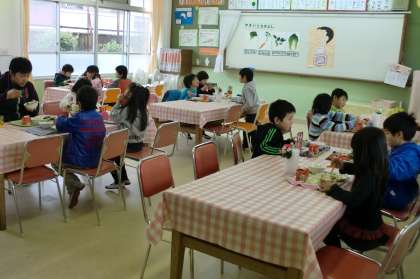 今日は1年3組がランチルームでした。チャーハンの具をごはんに上手に混ぜて食べていました。ごはんもおかずも残さずにしっかり食べることができました。