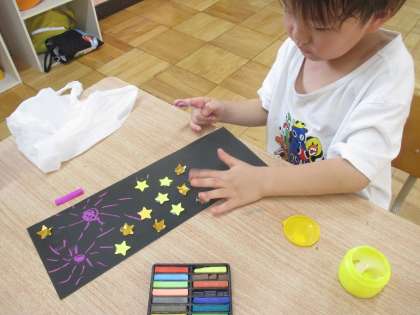 今日は、七夕です。夕方は、雨の予報でしたが、夜空に浮かぶ天の川と夏の星空が見えることを願って制作中です。指先をうまく使って、細かな星も貼っています。