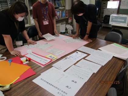 先週、第58回京都市小学校児童硬筆作品展の審査を終え、今日は、国語部で校内展示に向けての作業をしました。夏休み明けに、体育館前に掲示を予定しています。