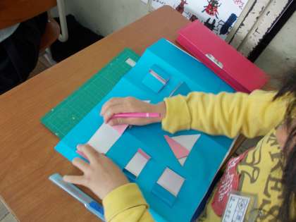図工で,カッターナイフを使い窓を開ける作品を作っています。