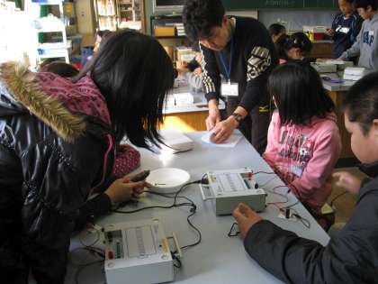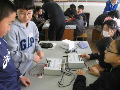 今日の理科の実験はエコへの関心を高めるものです。LEDが豆電球よりどれほど少ない電気で長く点灯するか,しっかりと見ることのできるものでした。各班とも協力して実験できていました。