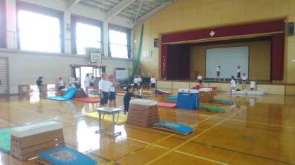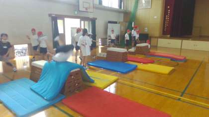 低い跳び箱・マットをひいた跳び箱・いろんな練習場所を用意し、少しずつ技を磨いているところです。