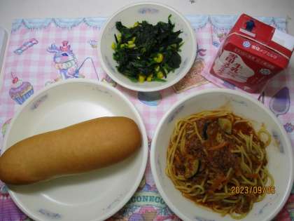 今日の献立は、小型コッペパン・牛乳・スパゲティのミートソース煮・ほうれん草のソテーでした。