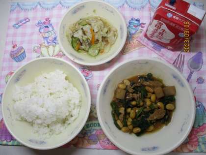 肉みそいためには、豚肉・大豆・ほうれん草・しょうが・にんにく・こんにゃく・しいたけが入っていました。ごはんがよく進む味付けで、子どもたちはおいしそうに味わって食べてくれていました。
