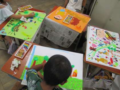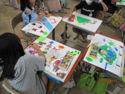 色を重ねたり、丁寧に色を塗りつぶしたりして、お話から思い浮かべたものをどんどんと楽しそうに描いていました。