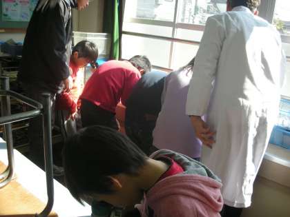 理科室に楽しい生き物があると聞き,探険に出かけました。カエルやサンショウウオの卵,イセエビの脱皮,何といってもハリセンボンの大変身には,子どもたちの「オー!」という歓声が上がりました。顕微鏡で塩の結晶も見せていただきました。