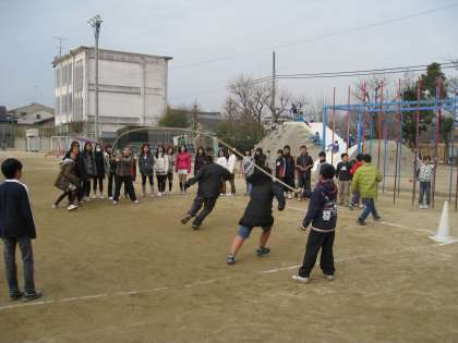 今日は大なわ大会二日目で,各学年の1組が挑戦しました。みんなで力を出し合って跳びました…なわをまわす人の技が光っていますね!