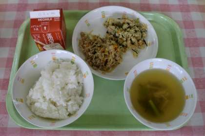 今日の献立は,「ごはん,牛乳,豚肉とこんにゃくのいため煮,おから,花菜のすまし汁」でした。
