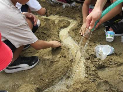 子どもたちからは、「上り坂だったら水が流れない!」「大きいシャボン玉できた!」「めっちゃ濡れたけど楽しかった!」という声が聞こえてきました。