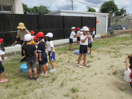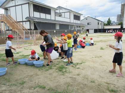 1年生は、生活科「なつだ!とびだそう」の単元で水あそびの学習をしました。砂遊び・水鉄砲・シャボン玉の3つの遊びに分かれて楽しく活動をしました。