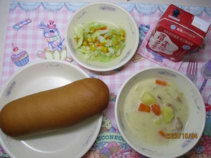 今日の献立は、黒糖コッペパン・牛乳・じゃがいものクリームシチュー・野菜のソテーでした。
