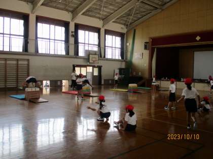 ボールけりゲーム・とびばこを行っている様子です。