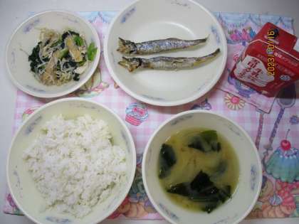 今日の献立は、麦ごはん・牛乳・ししゃものからあげ・もやしの煮びたし・みそしるでした。
