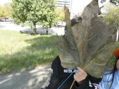 西寺公園で子どもたちは、「こんなに大きな葉っぱがあったよ。」「どんぐりも落ちているね。」「甘い匂いもする。」など、五感を働かせながら秋みつけに取り組むことができていました。学校に帰ってからは、見つけてきたことを思い出しながら、不思議に思ったことや新しく発見したこと、見つけた秋でどんなことができそうかを考えました。