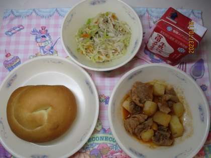 今日の献立は、バターうずまきパン・牛乳・豚肉のケチャップ煮・たっぷりやさいのビーフンでした。