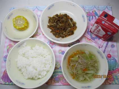 今日の献立は、ごはん・牛乳・和風ドライカレー・カットコーン・キャベツのスープでした。