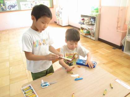 上学年との学習では、はさみで切り抜く難しいところを教えてもらう姿がありました。
