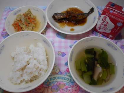 今日の献立は、「麦ごはん・キャベツのごま煮・いわしのかわり煮・すまし汁・牛乳」でした。