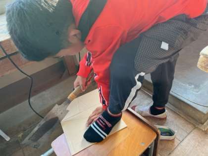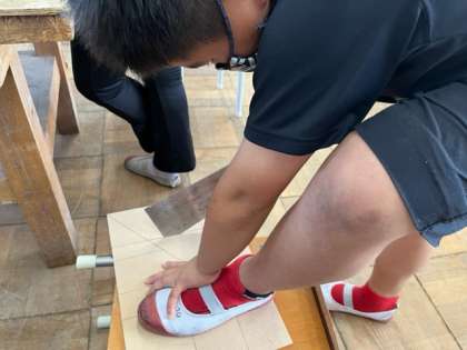 のこぎりの正しい使い方を動画で学習したあと、安全に気を付けて木を切っていきました。最初は難しく感じている子も多かったですが、授業の終わりには「だんだん慣れてきた!」という声も聞こえてきました。