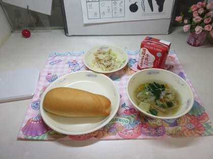 今日の給食は、「コッペパン・牛乳・ツナサンドの具・スープ」でした。