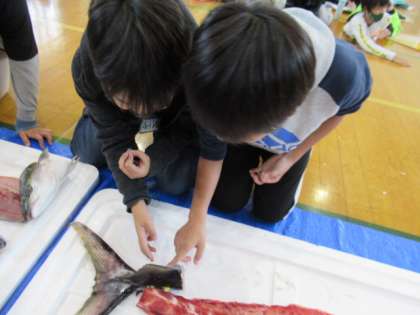 生の魚を見て触ったり、目の前でさばかれる様子を見たり、目を輝かせながらお話を聞きました。